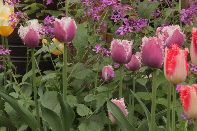 W tym sezonie 'Cummins' zakwitły jako ostatnie z Tulipanów. Zawsze były późne, a teraz rosną w cieniu, więc z kwitnieniem im się nie spieszy. W tym roku rosną w sąsiedztwie odmiany 'Purple Circus', która ma podobną kolorystykę.