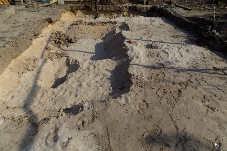 Po mrozach i pod wpływem opadów, boki wykopu się nieco obsunęły, trzeba będzie przed pracami murarskimi założyć zapory/szalunki