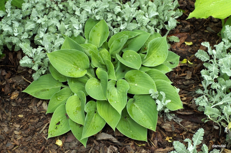 Rozmiar:S/M wysokość 25-30cm Liście: zielone, w kształcie serca, w trakcie sezonu zmieniają barwę na złocistą Kwiaty: lawendowe w czerwcu/lipcu Zalecane stanowisko: od słońca do cienia