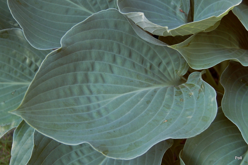 Liście: intensywnie szaroniebieskie, lekko burchlaste ; sercowate o łagodnie falującym brzegu i jaśniejszych, wyraźnych nerwach , bardzo charakterystyczne; przypudrowany back