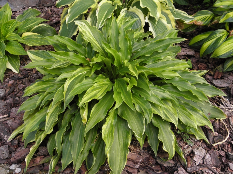 hosta typu streaked o dobrej substancji liścia, tolerująca większe nasłonecznienie.