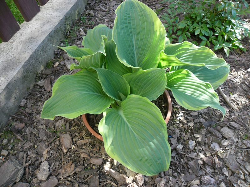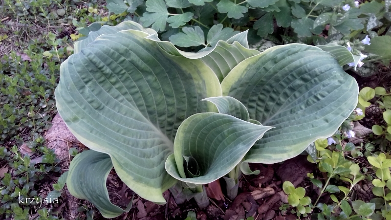 Liście: sztywne, duże (ponad 30 cm długości), sercowate; wiosną niebieskozielone z jasnozielonym , dośc wąskim, ale rozlewającym się w głąb liścia marginesem; w sezonie centrum staje się błyszczace, zielone a brzeg wyżółca się ; dobra substancja z lekkimi burchlami