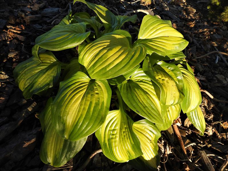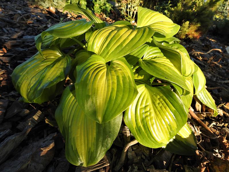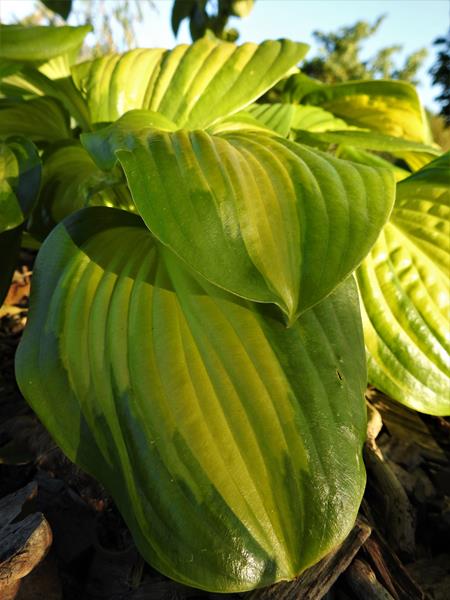 Liście: duże; okrągłe, lekko falujące i skręcone na czubkach; żółte centrum, zmieniające kolor z upływem czasu na kremowy, otoczone jest szerokim zielonym marginesem spływającym nieregularnie ku głównemu nerwowi