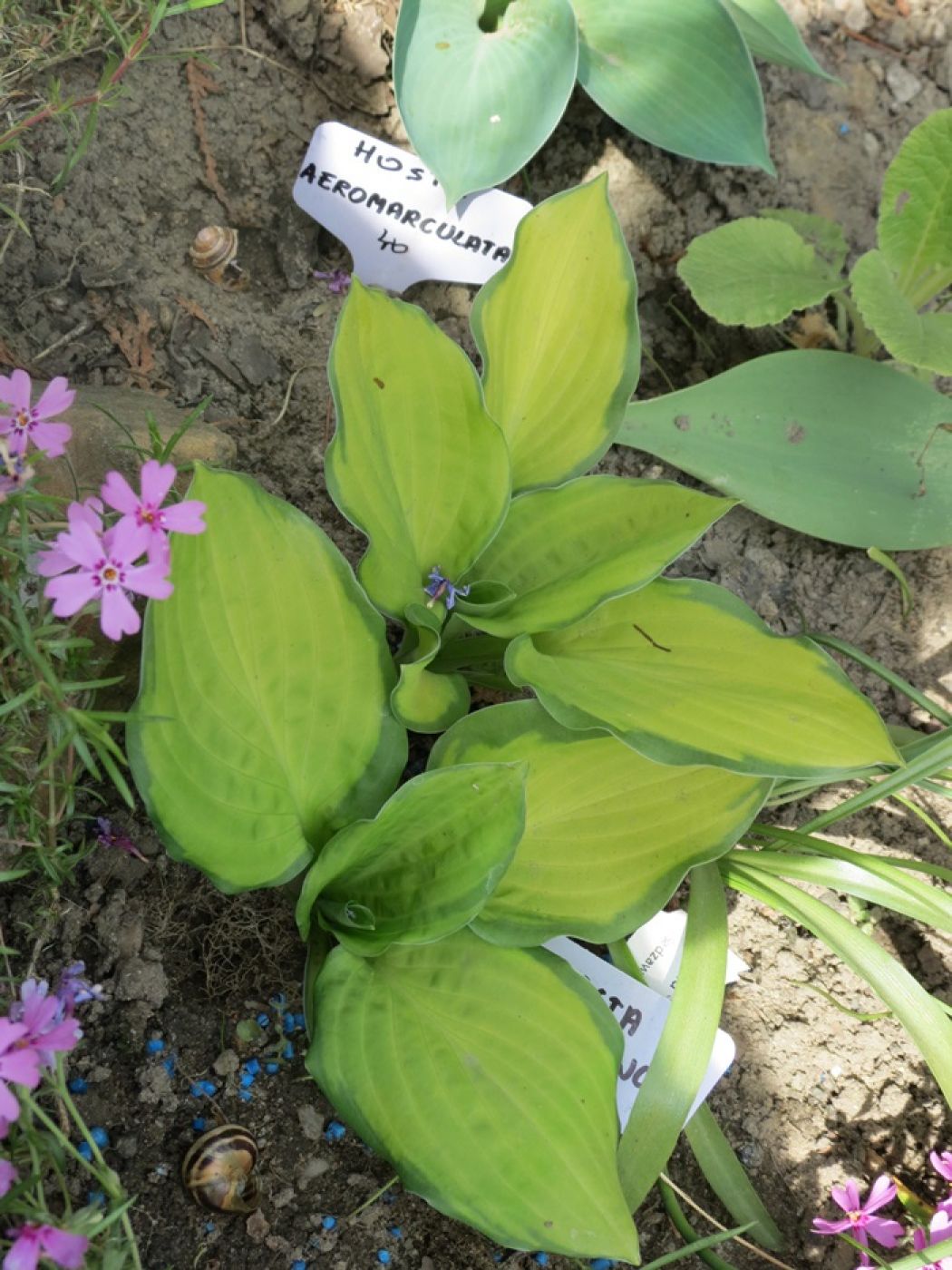 LIście: o rozmiarze około 18 x 10 cm; żółte centrum zmieniające się w trakcie sezonu do białego (w słońcu) z ciemnozielonym, nieregularnym marginesem