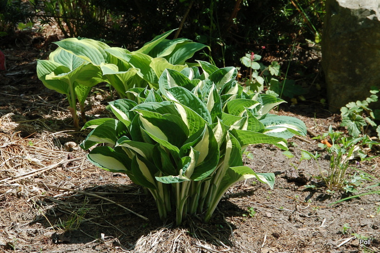 Hosta Risky Business - jedna z dorosłych kęp pochodzących z podziału rośliny - matki. Rośnie na nieco zbyt suchym stanowisku, ale daje radę To jedna z najłatwiejszych w uprawie odmian - polecam początkującym miłośnikom funkii.