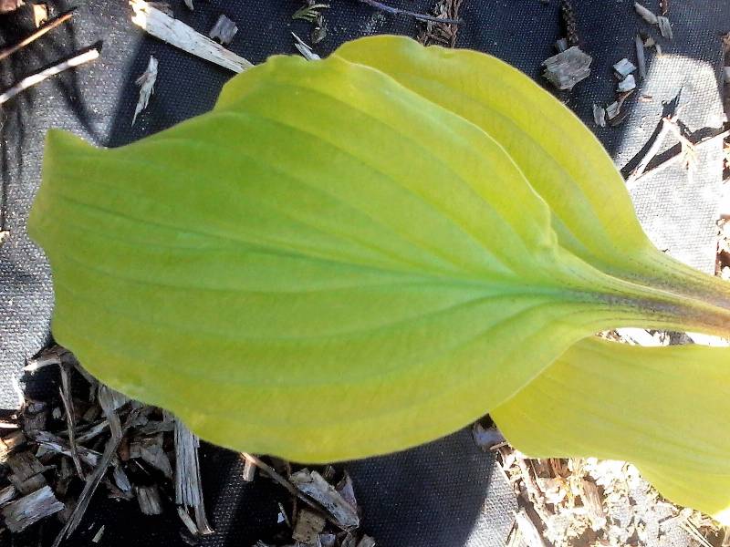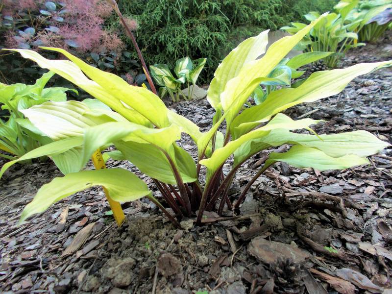 Hosta Lipstik Blondie rośnie w półcieniu, niemal w korzeniach glediczji, ale daje radę. Jej liście są dość długie, więc nieco podniosłam to miejsce, by się zwieszały.
