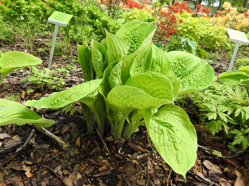 Rozmiar M wysokość 45-50cm Liście prawie okrągłe, wiosną jasno-żółte, zielenieją w ciągu sezonu. Kwiaty blado lawendowe /VI-VII/ i prawie okrągłych liściach. Zalecane stanowisko: półcieniste /toleruje większe nasłonecznienie/