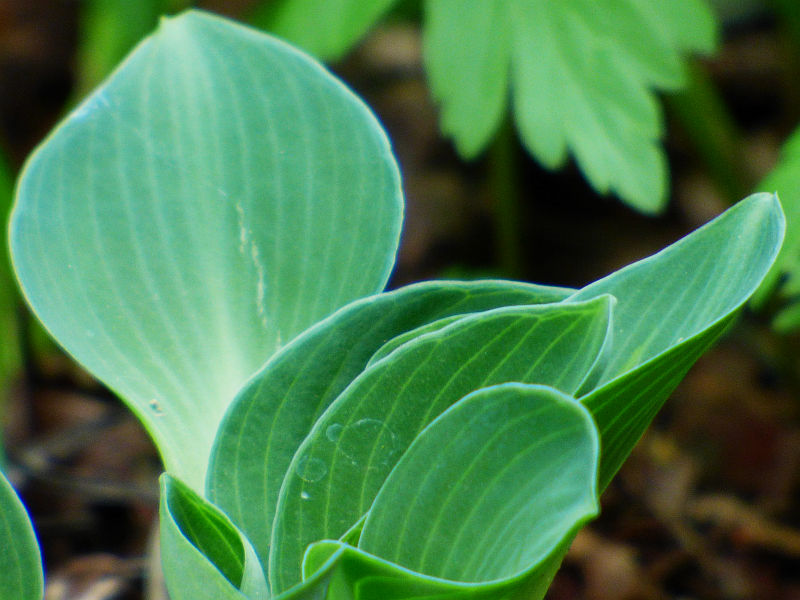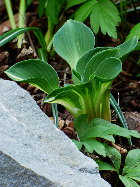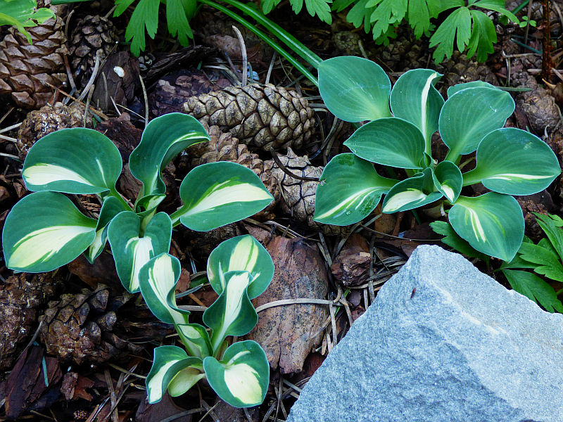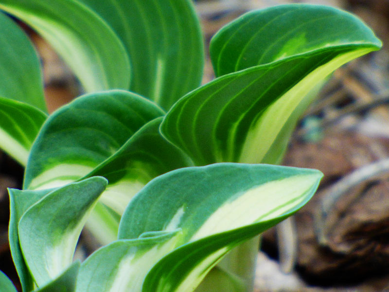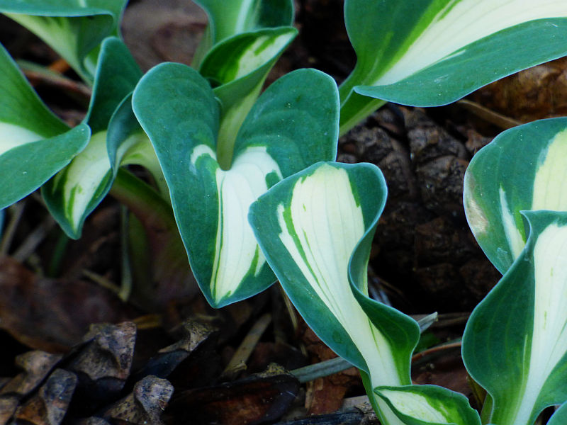 Liście: okrągłe, twarde... początkowo kremowo białe, szybko rozjaśniające się do czystej bieli centrum, częstokroć z zielonymi smużeniami i niebieskawo zielonym marginesem