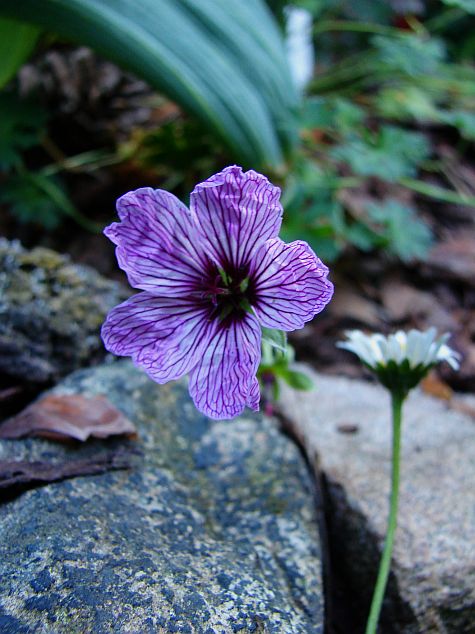 Bodziszek popielaty 'Ballerina' (Geranium cinereum) właśnie kwitnie na rabacie paprociowej