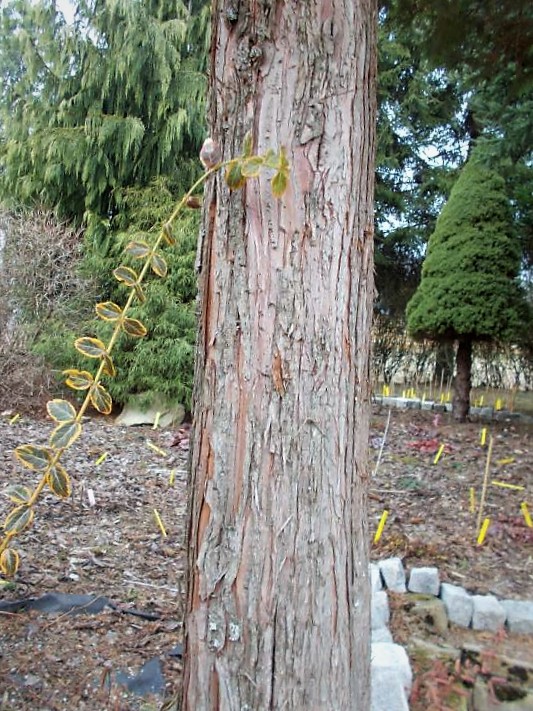 Pień prosty, gładki, w dolnych partiach szeroko karbowany. Kora czerwonobrązowa, z wiekiem łuszcząca się długimi pasami. Dolne części gałązek silnie wybarwione na niebieskobiały kolor.