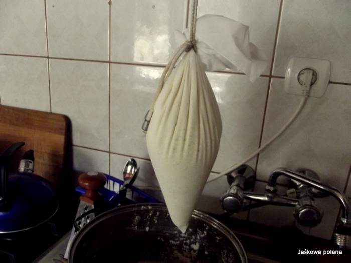 6. Po pierwszym ocieknięciu usunęłam chustę, a serek powędrował bezpośrednio na sitko.