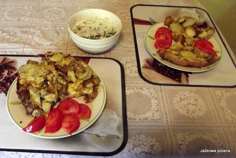 Drugie danie na szybko to tortilla - znajoma hiszpańska zakonnica mnie nauczyła. Na jakimś filmie H. Ford robił podobne danie i nazywał to fritata. Jak zwał tak zwał. Potrzebujemy pyry ugotowane w mundurkach. Najlepiej dzień wcześniej ugotować podwójną porcję - część wykorzystać do pyrów z gziką, resztę następnego dnia obrać ze skórki, pokroić w talarki i podsmażyć na tłuszczu na złoto razem z pokrojoną cienko cebulą (wcześniej można ja na chwilę zalać wrzątkiem - mniej wzdyma) dodać suszone pomidory, paprykę pokrojona w kawałki, gotowana fasolkę szparagową, co tam komu w lodówce zalega i całość zalać roztrzepanymi jajami doprawionymi wg uznania- 2-3 szt.