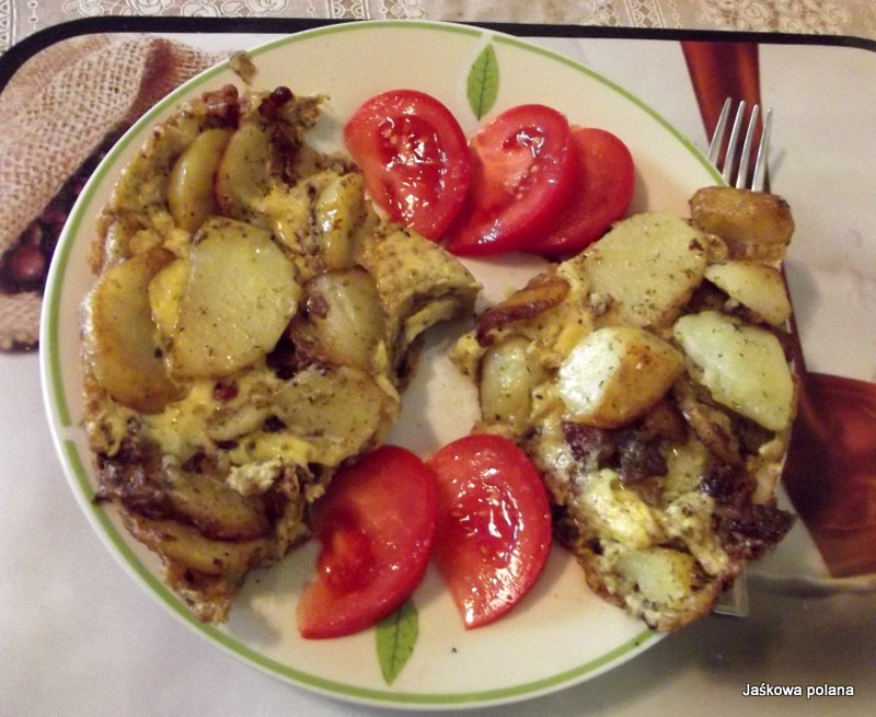 Ważne - smażymy na tzw wolnym ogniu, żeby nie przypalić, na patelni wielkości talerza obiadowego pod dopasowaną pokrywką bez rantów (krawędzi_ pod spodem). Gdy spód jest zrumieniony a wierzch względnie ścięty to przewracamy - czyli patelnia w jedną rękę, drugą dociskamy pokrywkę, żeby się resztki nie ściętego jaja nie wylały, odwracamy "do góry nogami", zsuwamy tortillę na patelnię, przykrywamy pokrywka i dopiekamy. Najlepiej do tego pasują świeże pomidory.