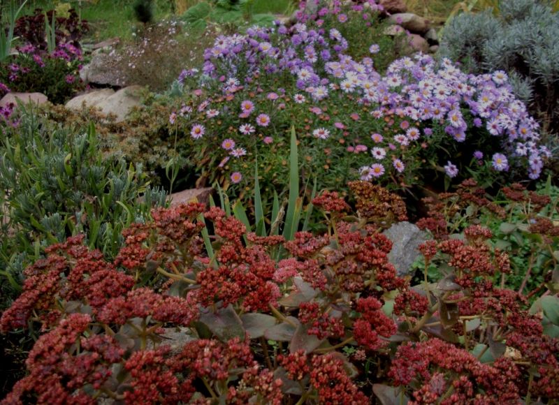 Jesienią na suchej rabacie królują rozchodniki i trawy.