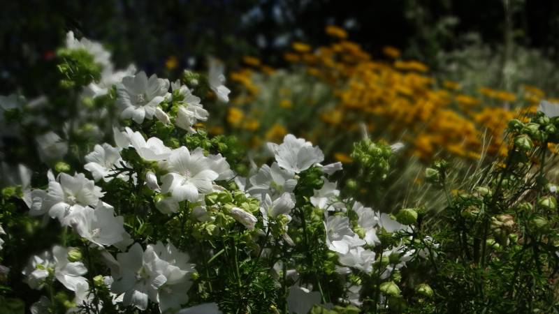 Mam już bardzo dobry zestaw startowy: ślazówka biała – wysoka, delikatna, biała, kwitnie latem, idealnie wypełni przestrzeń po makach