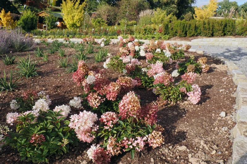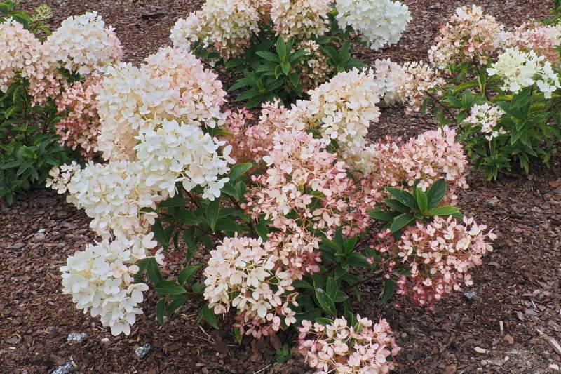 Kwiaty: początkowo czysto białe z czasem różowieją, a z upływem sezonu przybierają na intensywności, kwiatostany rozwijają się nierównomiernie, dzięki czemu na jednej kępie podziwiać można niesamowitą rewię barw