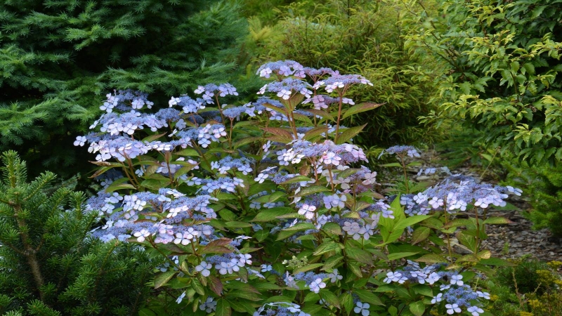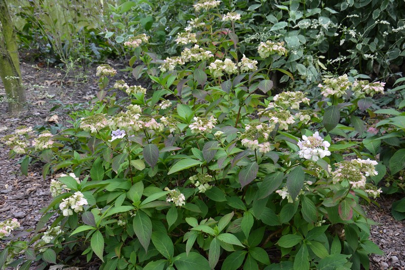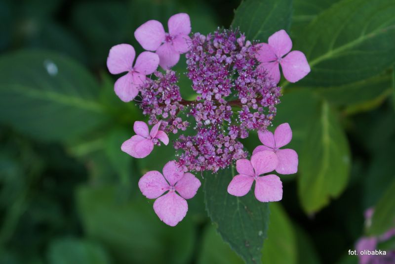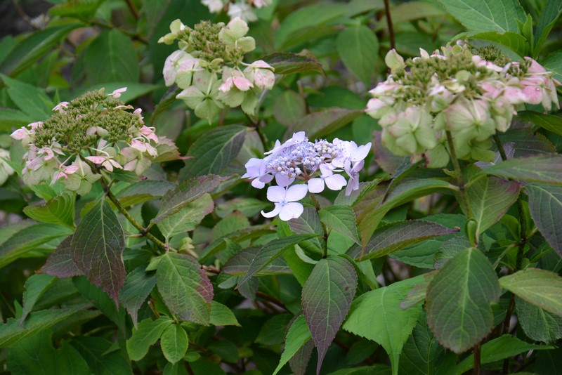 U mnie w tym roku wreszcie ma więcej kwiatów hortensja piłkowana 'Blue Bird' - chyba pomogło podcięcie gałęzi sosny i dopuszczenie większej ilości światła Ponoć jesienią ładnie jej się przebarwiają liście, ale jeszcze tego nie zauważyłam