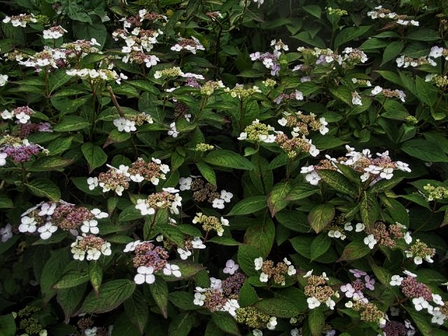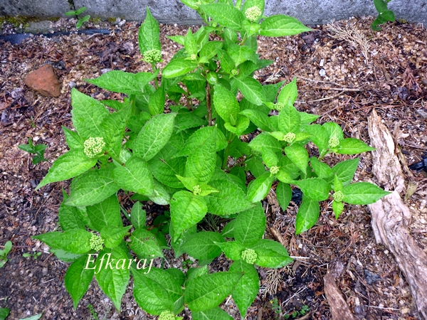 U mnie w tym roku wreszcie ma więcej kwiatów hortensja piłkowana 'Blue Bird' - chyba pomogło podcięcie gałęzi sosny i dopuszczenie większej ilości światła think: Ponoć jesienią ładnie jej się przebarwiają liście, ale jeszcze tego nie zauważyłam :silly: