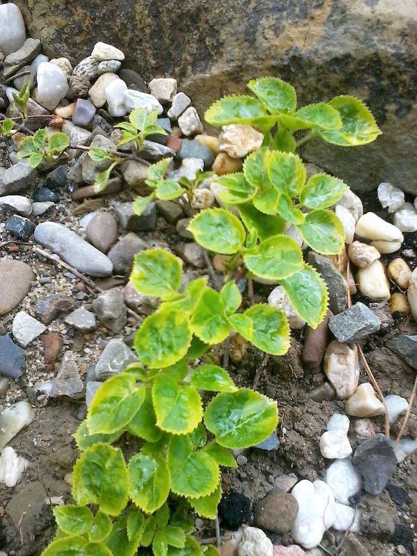 Liście: dwubarwne, zielone z jasnożółtozielonym obrzeżeniem, prawie okrągłe, średnicy 5-10 cm, z piłkowanymi brzegami.