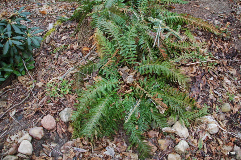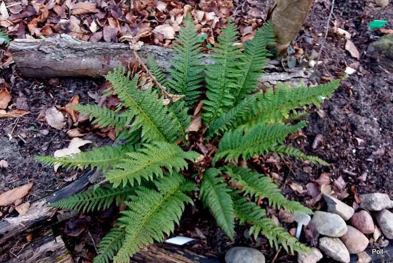 Polystichum aculeatum, dwa kilkuletnie egzemplarze na górce przy oczku wodnym, przezimowały kapitalnie. Gdyby nie nieco przyklapnięte liście, wydawać by się mogło, że to jesień a nie zima. (fot.06.03.2017)