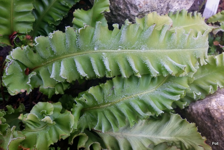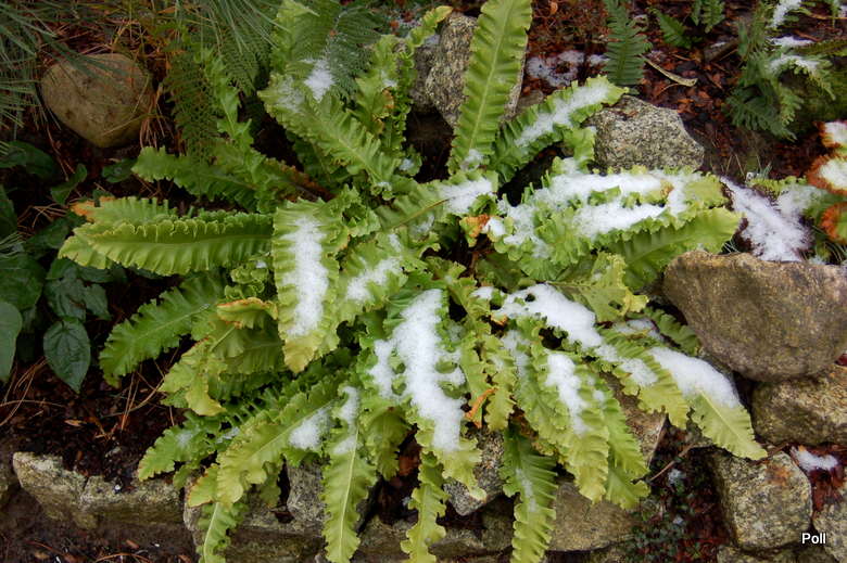 Niedługo trzeba będzie szykować iglasty stroisz, by zabezpieczać paprocie, ale przymrozki około -10C, nie są jeszcze groźne dla Asplenium scolopendrium 'Crispum'