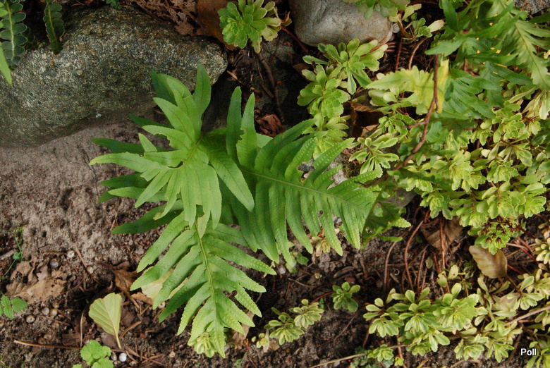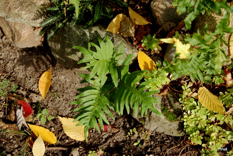 Polypodium cambricum 'Oxford Gold' dwa lata temu weszło kłączem pod kamienie i w tej chwili wybija tylko z tego miejsca. Górna, głowna część prawdopodobnie obmarzła