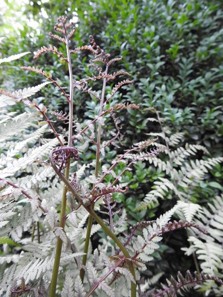 Athyrium filix-femina odziedziczyła wzniesiony pokrój, natomiast srebrzystą barwę liści po