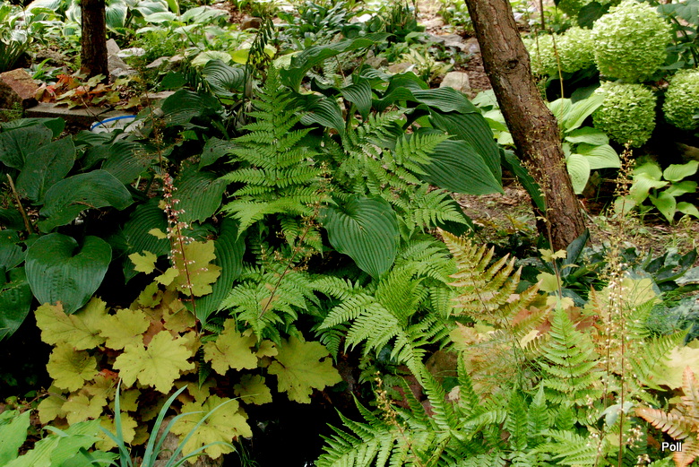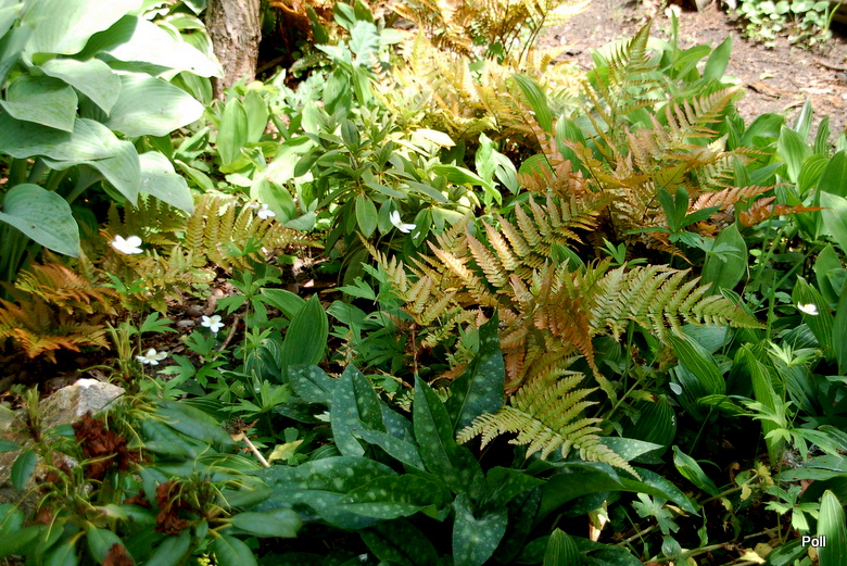 Dryopteris erythrosora z hostami , konwaliami i miodunkami, na dość słonecznym miejscu starego hostowiska