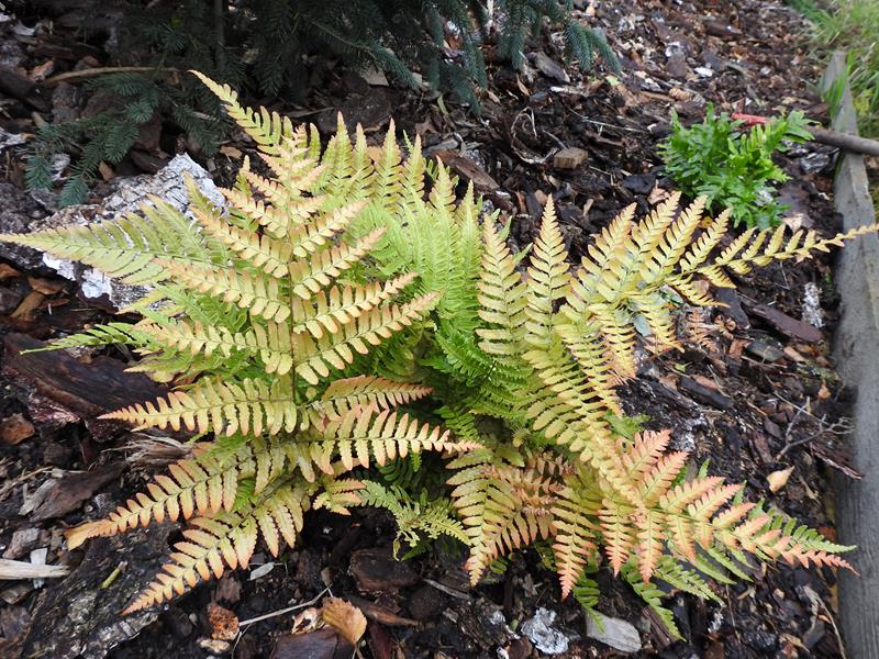 Dryopteris erythrosora na stoku paprociowym ( po prawej