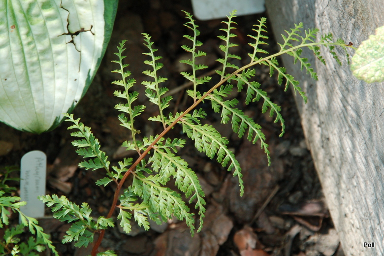 wietlica samicza. Jasnozielone, lekko pierzaste listki położone są mijankowo, parami, na wyraźnie czerwonych osadkach a ich wierzchołki mogą być czasem rozszczepione, tworząc 2, lub 3 ząbki. Zarodniki są ukryte pod spodem liści i osłonięte brązowymi zawijkami o kształcie litery J, lub U.