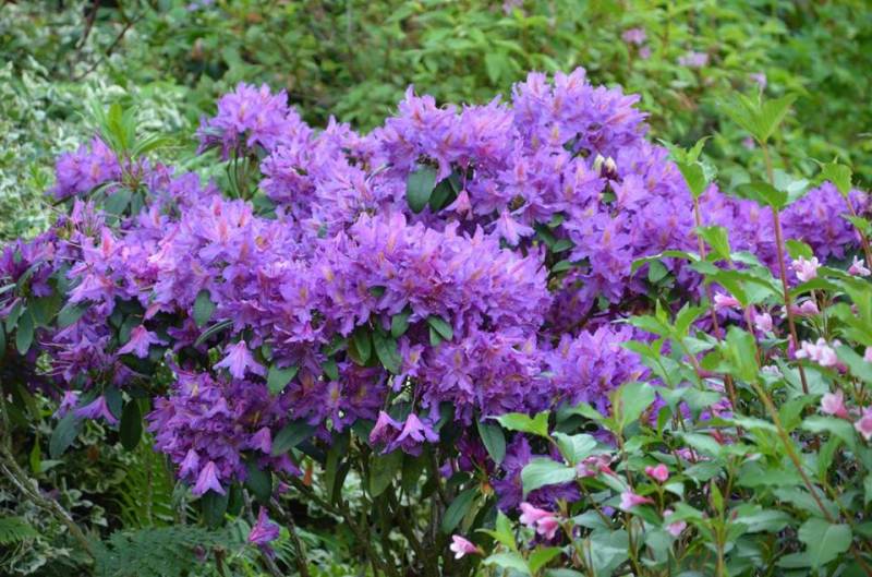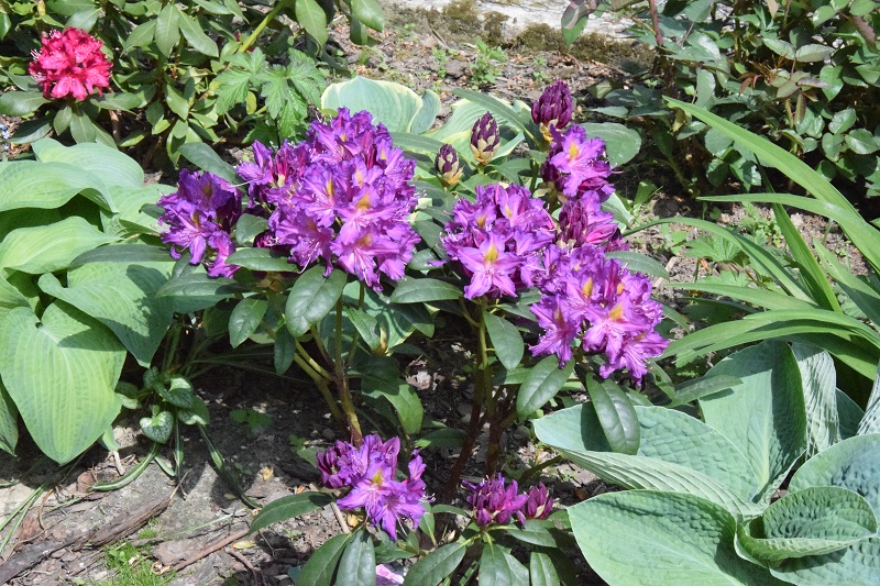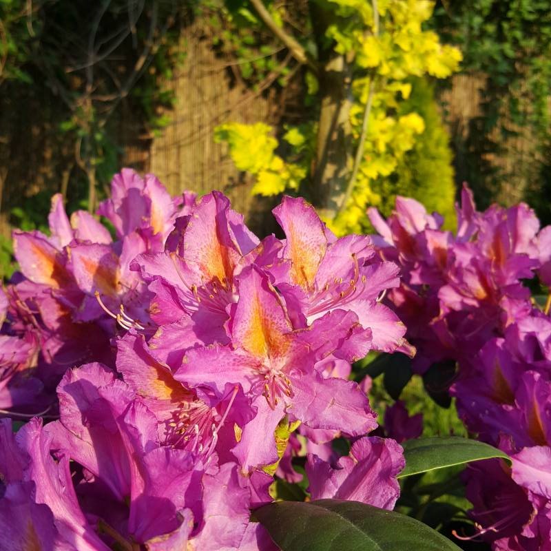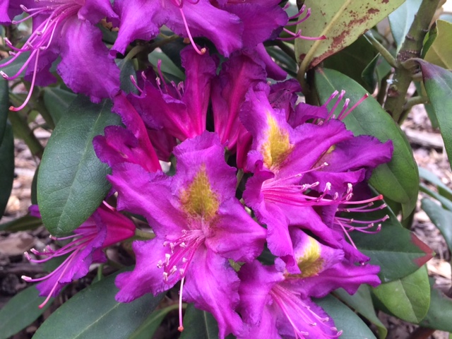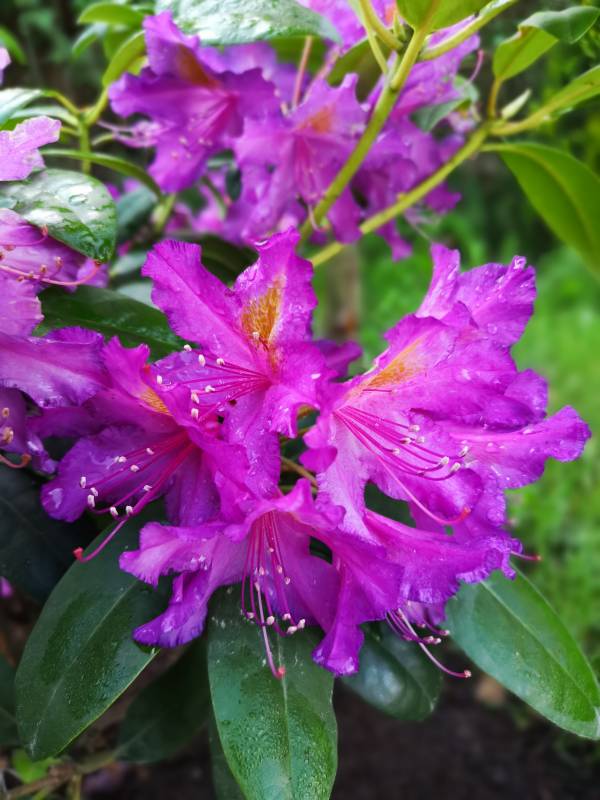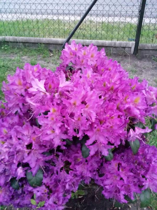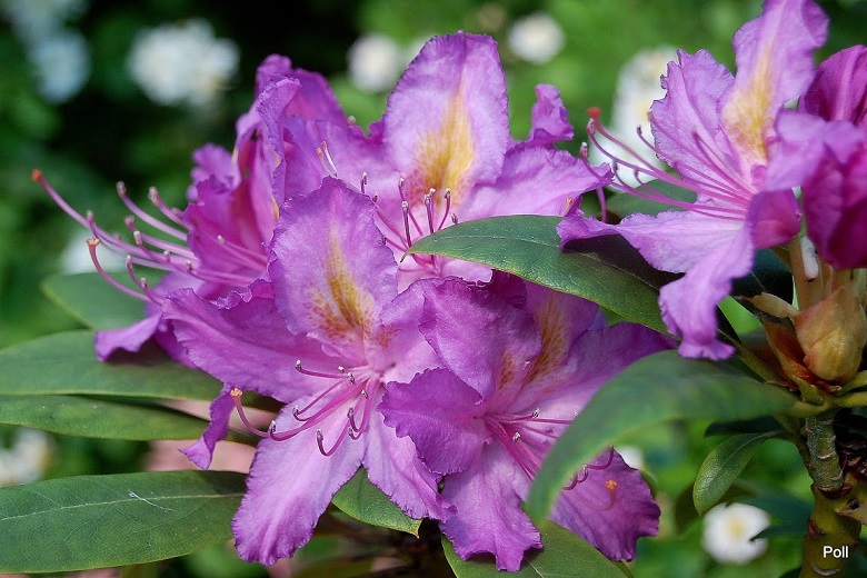 Kwiaty: purpurowo fioletowe, nieco jaśniejsze w gardzieli z wyraźną i dużą oliwkowozieloną do brązowawej plamką na górnym płatku... brzegi płatków pofalowane... średnica pojedynczego kwiatu od 7 do 8 cm... zebrane po 11-14 sztuk w szerokie, kuliste kwiatostany... nie blakną w pełnym słońcu