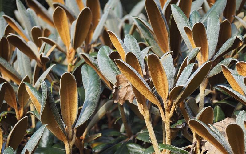 Liście: atrakcyjne... ciemnozielone i błyszczące z wierzchu, od spodu z grubą, płowobrązową, filcowaną wyściółką... eliptyczne do szeroko lancetowate, lekko wysklepione... młode pokryte kremowo beżowym kutnerem