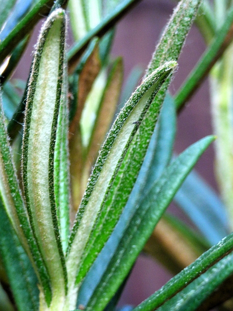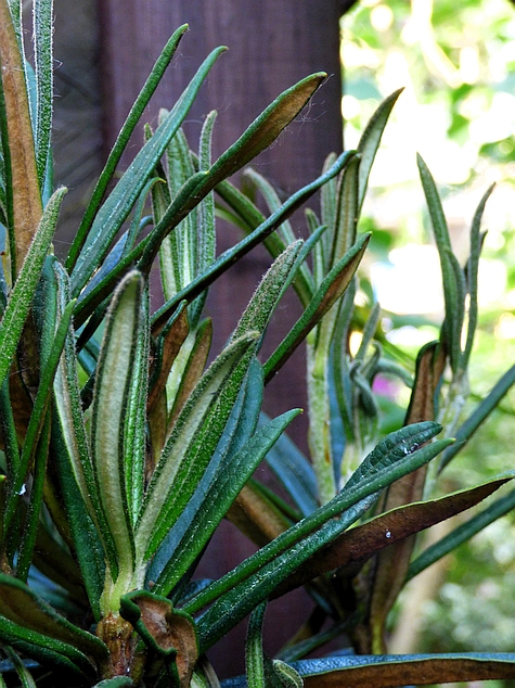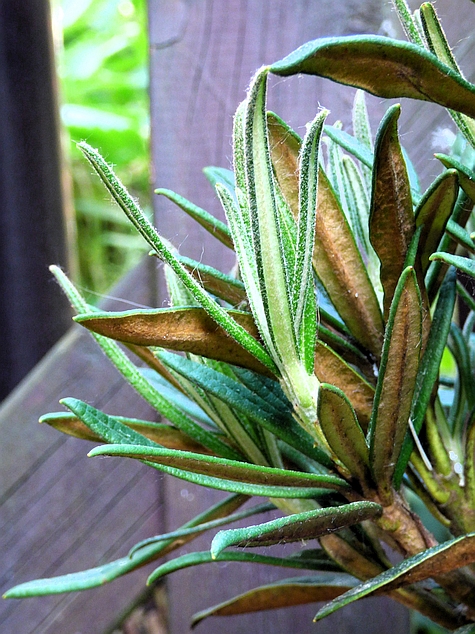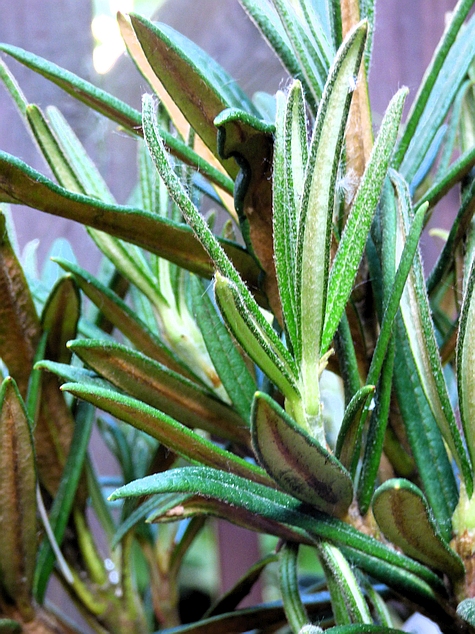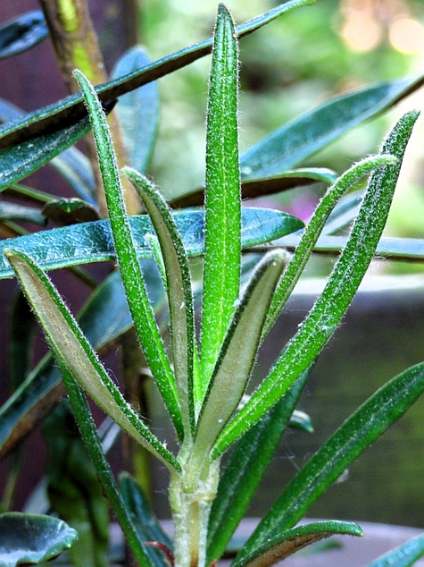 bardzo wąsko lancetowate...o długości od 6 do 9 cm przy szerokości li tylko od 0.8 do 1,7 cm (!)... młode jasnozielone, pokryte beżowym kutnerem z charakterystycznie, mocno wygiętymi blaszkami liściowymi, rosną pionowo i przypominają igły... dojrzewając ich powierzchnia rozwija się i ciemnieje
