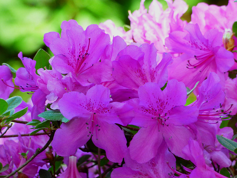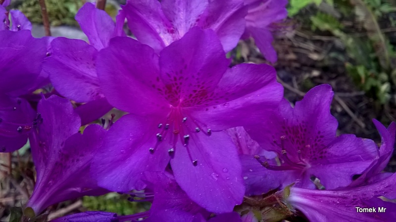 Kwiaty: w pąku ciemnopurpurowe, po otwarciu purpurowofioletowe z wyraźnymi, winnoczerwonymi cętkami na górnym płatku... szerokodzwonkowate... dość duże, średnica pojedynczego kwiatu od 4,2 do 4,8 cm... liczne, zebrane po 2-5 sztuk w płaskokuliste kwiatostany gęsto pokrywające całą roślinę