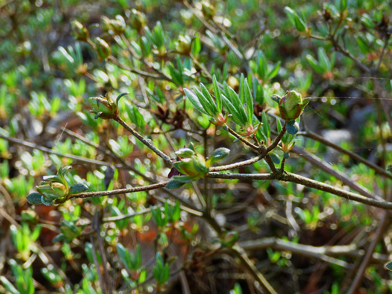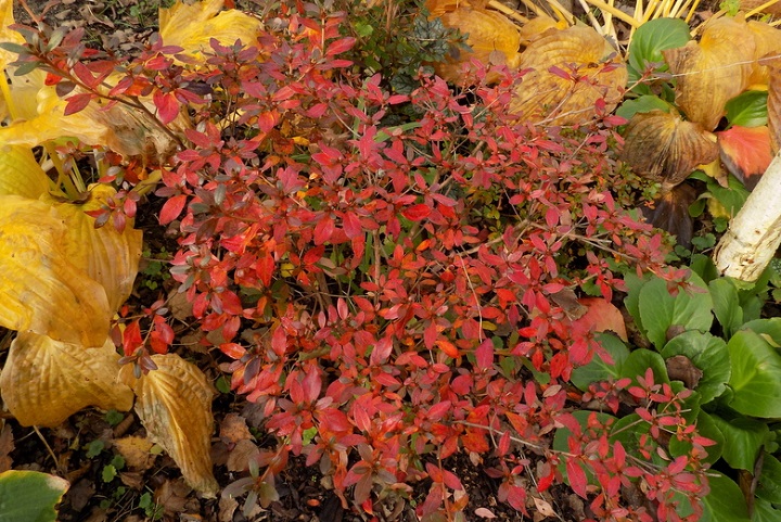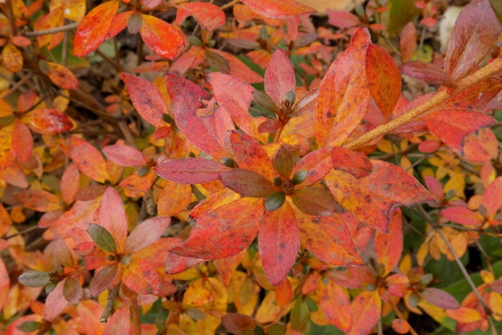 Liście: półzimozielone... ciemnozielone, błyszczące... szerokojajowate... o długości od 2,8 do 3,5 cm... młode pokryte srebrzystym nalotem... jesienią przebarwiają się na brązowopurpurowo... zimą pozostają na krzewie nieliczne