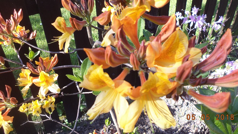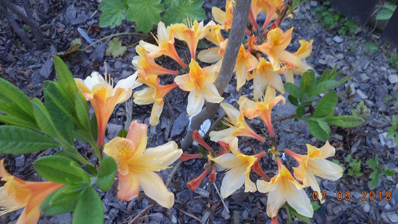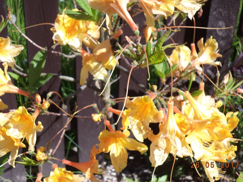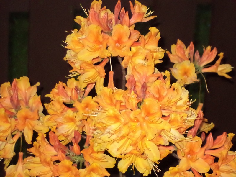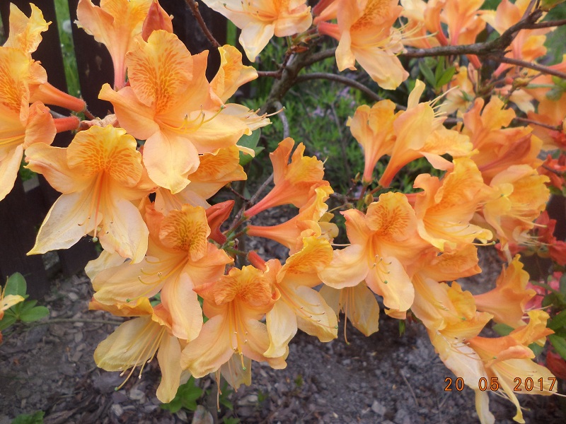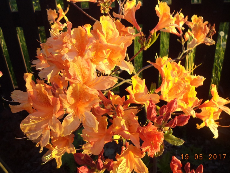 Kwiaty: w pąku pomarańczowe, po rozwinięciu pomarańczowo żółte z wyraźnym, ciemnopomarańczowym rysunkiem na górnym płatku... na zewnątrz nieregularnie, czerwonawo nabiegłe... duże, średnica pojedynczego kwiatu od 7 do 7,5 cm... zebrane po 15-17 sztuk w wierzchołkowe, kuliste kwiatostany