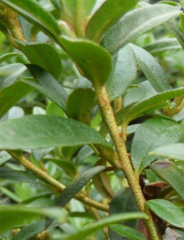 Liście: ciemnozielono brązowawe, błyszczące... drobne, wąsko eliptyczne
