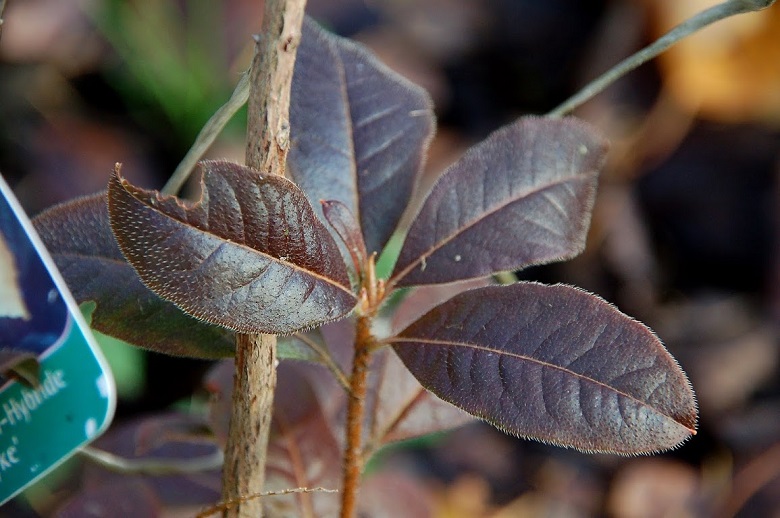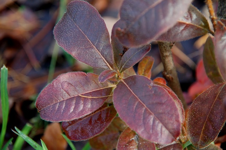 Liście: sezonowe, ciemnozielone, błyszczące... młode ciemnobrązowo czerwone... jesienią przebarwiające się ponownie na brązowo