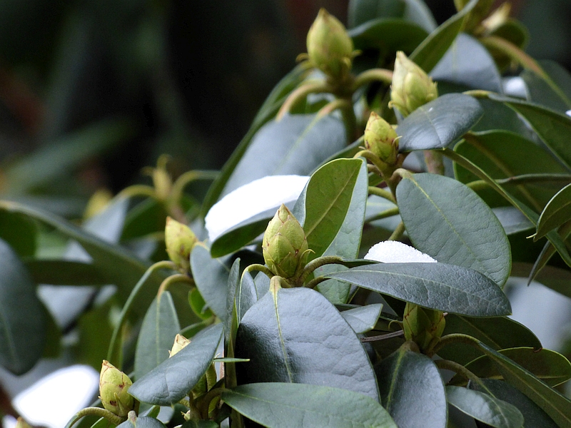 Liście: ciemnozielone, skórzaste, z wierzchu lekko błyszczące, pod spodem jaśniejsze i matowe... jajowate, długości od 9 do13 cm .