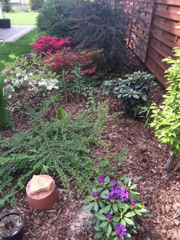 dla planujących grę kolorów na rabacie- w dole zdjęcia kwitnący już Acapulco, głębiej za grabem zapakowany jeszcze w pąkach Rasputin