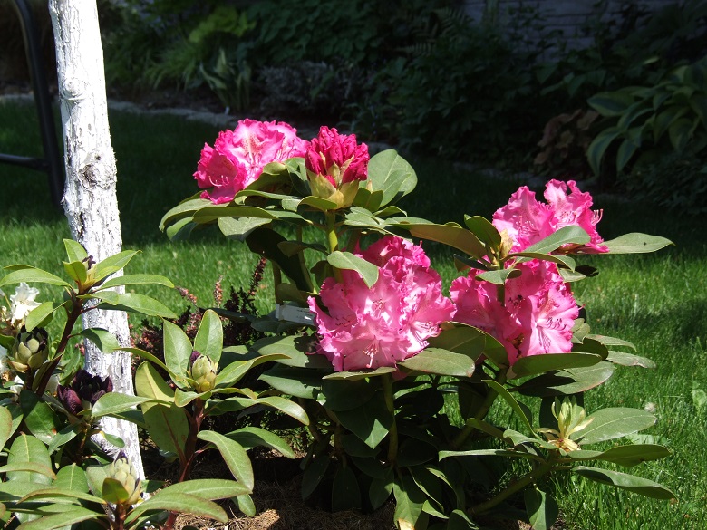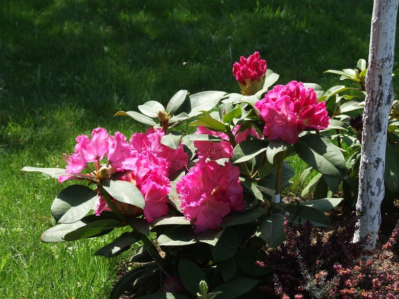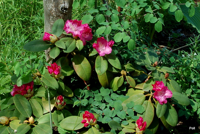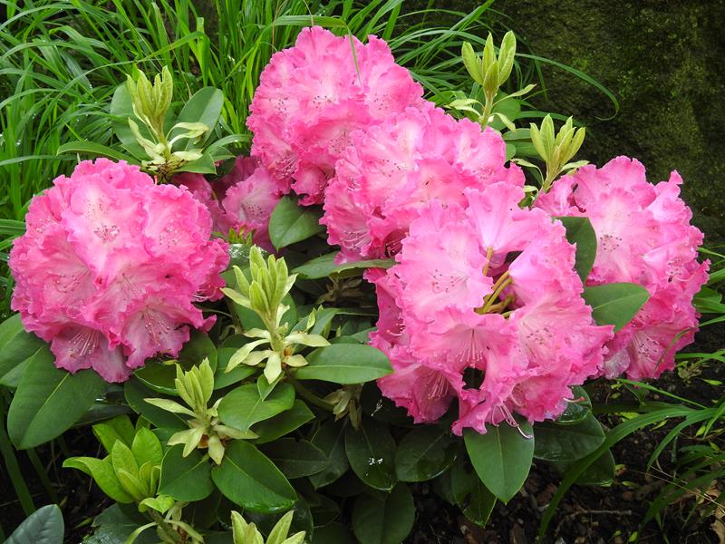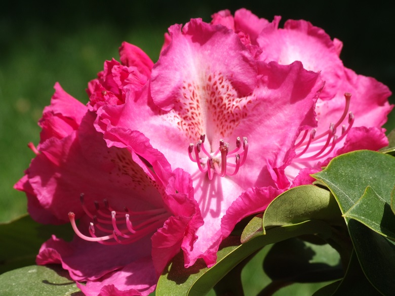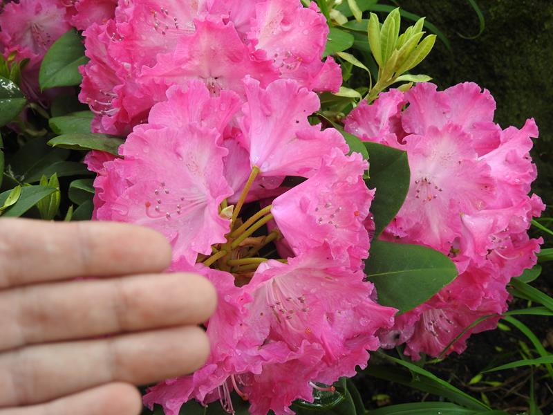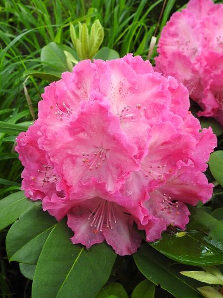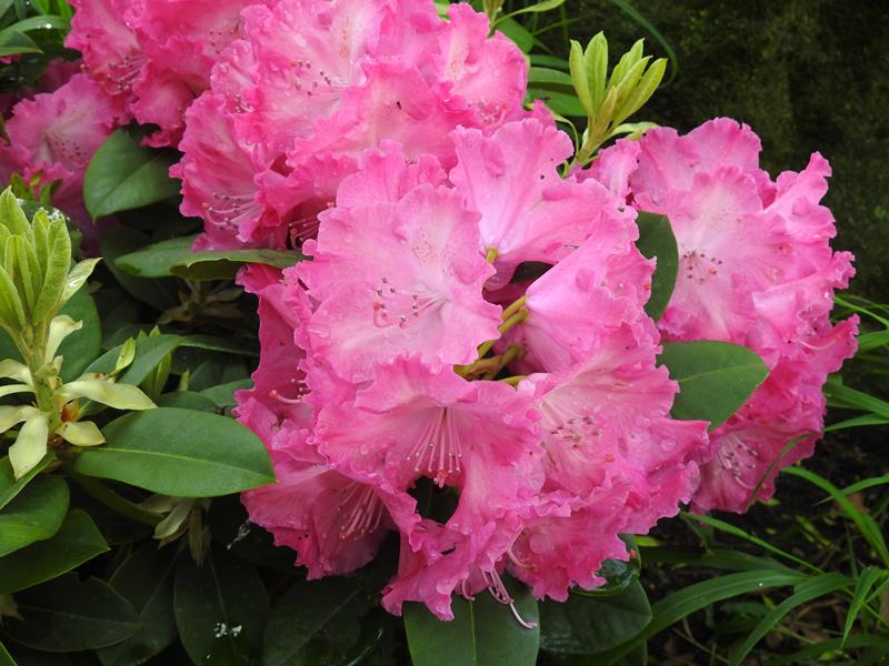 Kwiaty: w pąku ciemnoróżowe, po otwarciu równie intensywnie różowe, ale jaśniejące ku środkowi aż do białego z nielicznymi czerwonobrązowymi do pomarańczowoczerwonych cętkami na górnym płatku... brzegi płatków mocno pofalowane... duże, średnica pojedynczego kwiatu od 6 do 9 cm... liczne, zebrane po 12 do 19 sztuk w wierzchołkowe kwiatostany