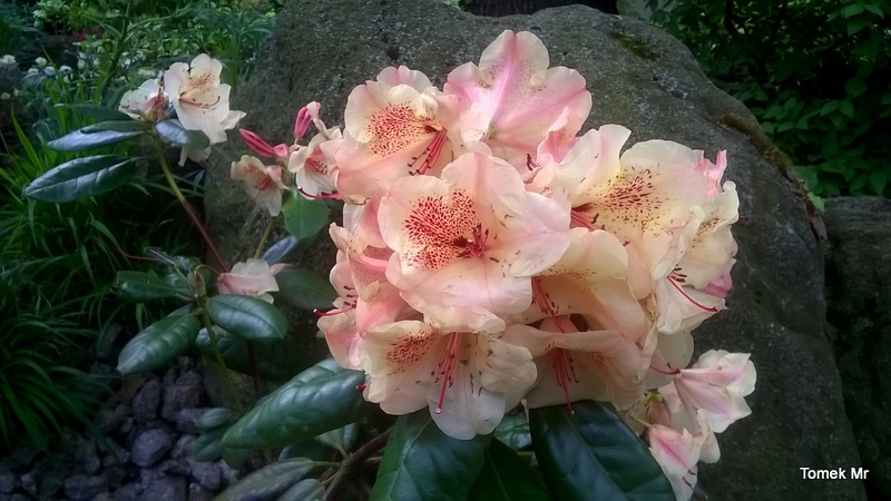 Kwiaty: w pąku pomarańczowo różowawe, po otwarciu wewnątrz początkowo miedziano żółte, z czasem kremowe z wyraźnymi, purpurowymi cętkami na górnych płatkach, na zewnątrz bladoróżowe i pręgowane... dzwonkowate... bardzo duże, średnica pojedynczego kwiatu do 11 cm... zebrane po 5-10 sztuk w luźne, wierzchołkowe kwiatostany
