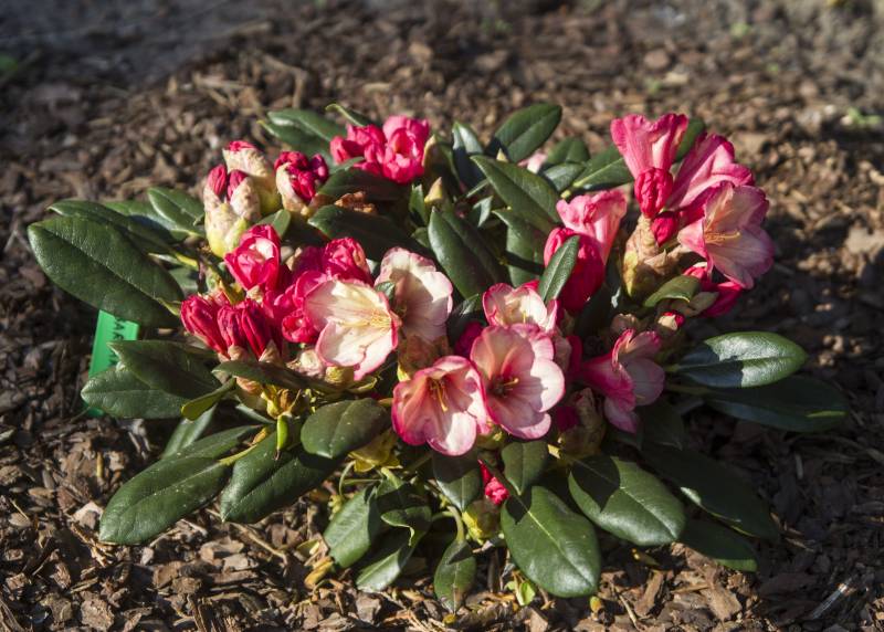 Kwiaty: w pąku różowe z nutą pomarańczową, po otwarciu dwukolorowe, pomarańczowo różowoczerwonawe krawędzie i jasnożółte centrum z nielicznymi, bardzo słabo zaznaczonymi cętkami na górnym płatku... brzegi płatków lekko pofalowane... dzwonkowate... średnica pojedynczego kwiatu do 5,5 cm... zebrane po 6–8 sztuk w luźne, wierzchołkowe kwiatostany