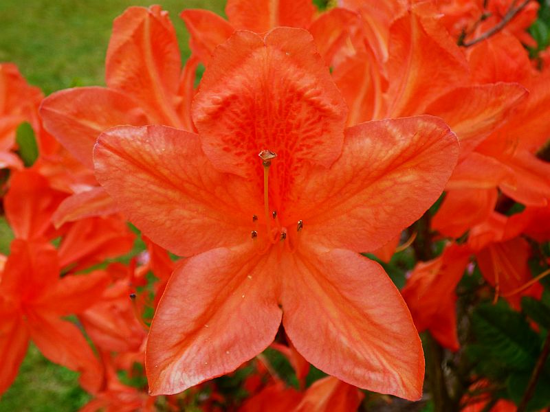 Selekcjoner: Waterer, Wielka Brytania (wprowadzenie do handlu: 1952) Pokrój: rozłożysty, wzniesiony Siła wzrostu: bardzo duża... po 10 latach dorasta do około 1,80 m wysokości i około 1,60 m szerokości Liście: sezonowe, jasnozielone Kwiaty: intensywnie pomarańczowe z nutą czerwieni na obrzeżach i wyraźną, ciemnopomarańczową plamką na górnym płatku... lejkowate, szeroko otwarte... średnica pojedynczego kwiatu około 6 cm... zebrane po 8-14 sztuk w szerokie, wierzchołkowe kwiatostany Zapach: niewyczuwalny Termin kwitnienia: przełom maja i czerwca Mrozoodporność: ?