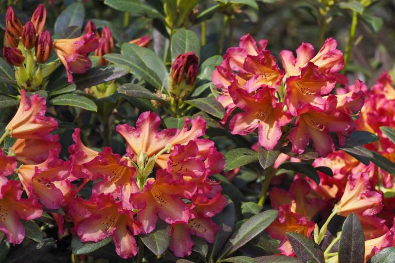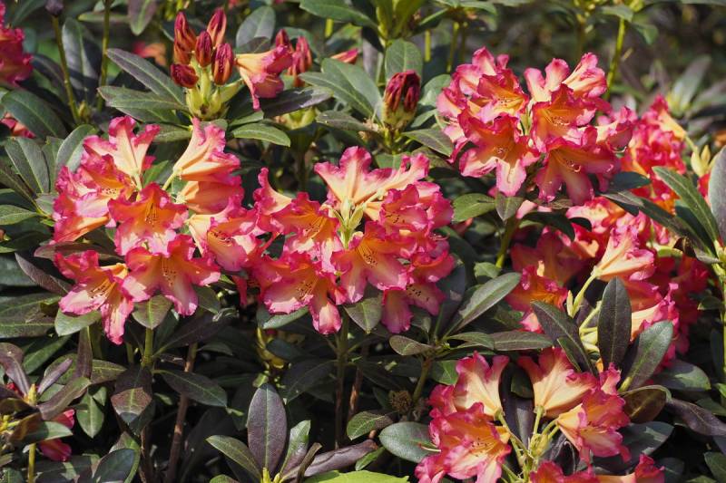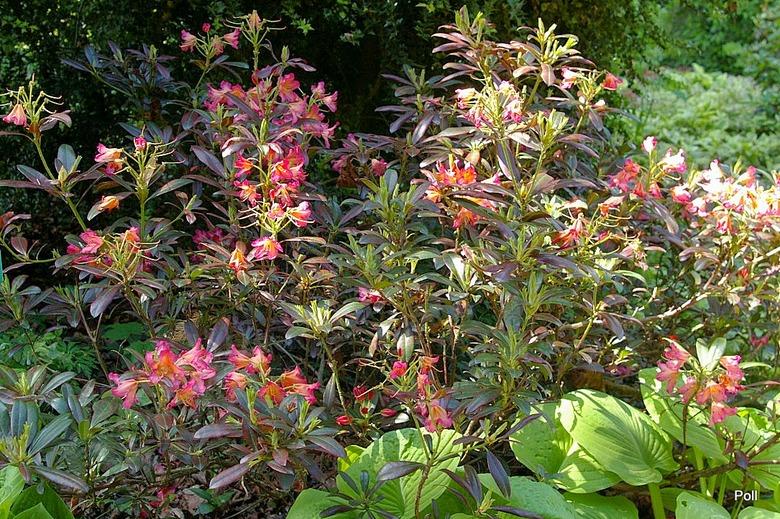 Pochodzenie: NN (wprowadzenie do handlu: 1975) Pokrój: gęsty, zwarty Siła wzrostu: roślina wolnorosnąca... po 10 latach dorasta do około 1 m wysokości Liście: ciemnozielone i błyszczące Kwiaty: w pąku czerwonawo pomarańczowe... po otwarciu wielobarwne, jasnopomarańczowe centrum z wyraźnym, winnoczerwonym rysunkiem na górnym płatku i czerwonawo różowymi, pofalowanymi krawędziami... lejkowate... zebrane po około 10 sztuk w wierzchołkowe kwiatostany Termin kwitnienia: połowa maja Mrozoodporność: do -18 °C (ARS)/ -21 °C (Salley & Greer) ---> zaleca się sadzenie tylko w cieplejszych rejonach kraju, na stanowiskach osłoniętych oraz okrywanie roślin na zimę