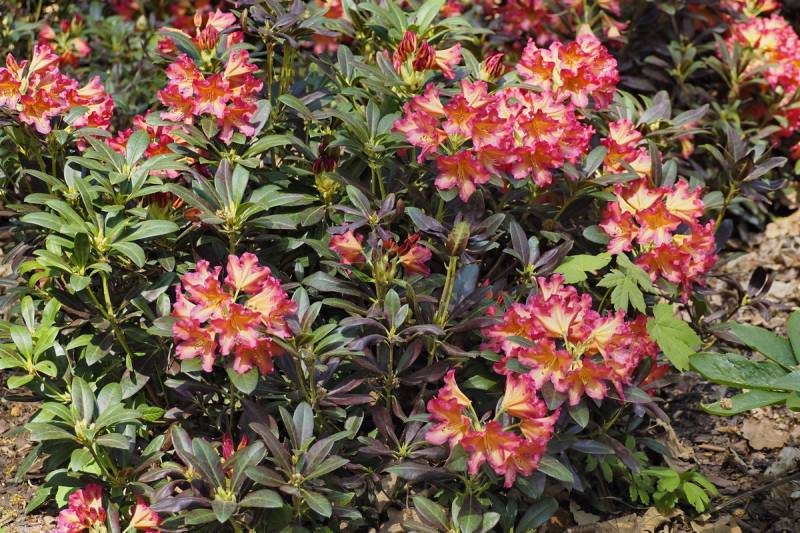 Niesamowicie ciekawa kolorystyka. Pomarańczowo- różowe kwiaty na tle bordowo podbarwionych liści przyciągają naszą uwagę już z dalszej odległości. Inny niż rosnące wokoło odmiany.