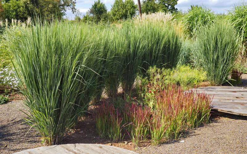 Proso 'Straight Cloud' na całkowicie słonecznym stanowisku o słabej, piaszczystej glebie (po prawej widać działający tryskacz, który leje wodę bezpośrednio na jedną z kęp)