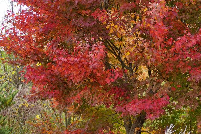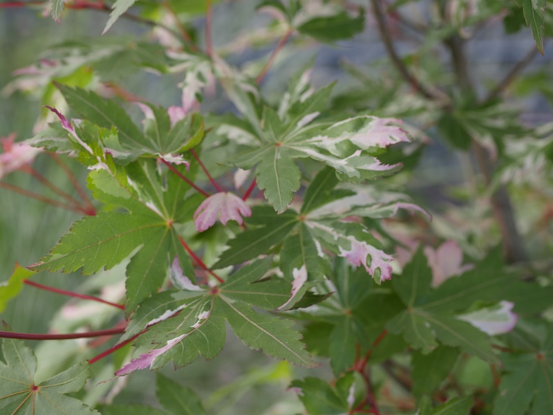 Liście: niewielkie, 5-7 klapowe, wiosną kremowo, czerwono, różowe, latem zielone z różowymi i kremowymi akcentami, kolory są żywe, wyraziste.