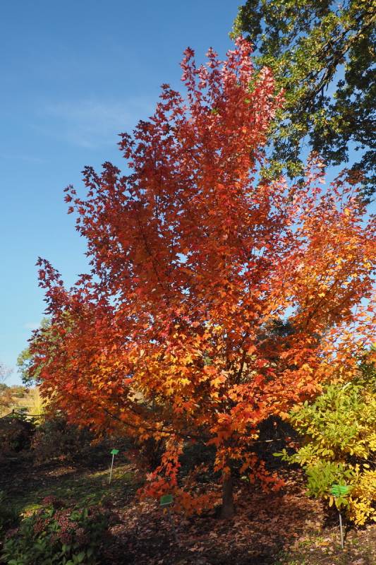 w przeciwieństwie do gatunku jego liście nie ulegają chlorozom i żółknięciu w przypadku uprawy na glebach o nieodpowiednim, zbyt wysokim pH Wielkość: dorasta do 15 m wysokości, ma silny przewodnik i regularnie ułożone gałęzie, tworzy szeroko-stożkowatą koronę Liście: trójklapowe, na brzegach nieregularnie ząbkowane, u nasady sercowate, z wierzchu ciemnozielone i błyszczące, od spodu jaśniejsze, matowe, jesienią przebarwiają się na intensywnie czerwony kolor. Mrozoodporność: dobra.