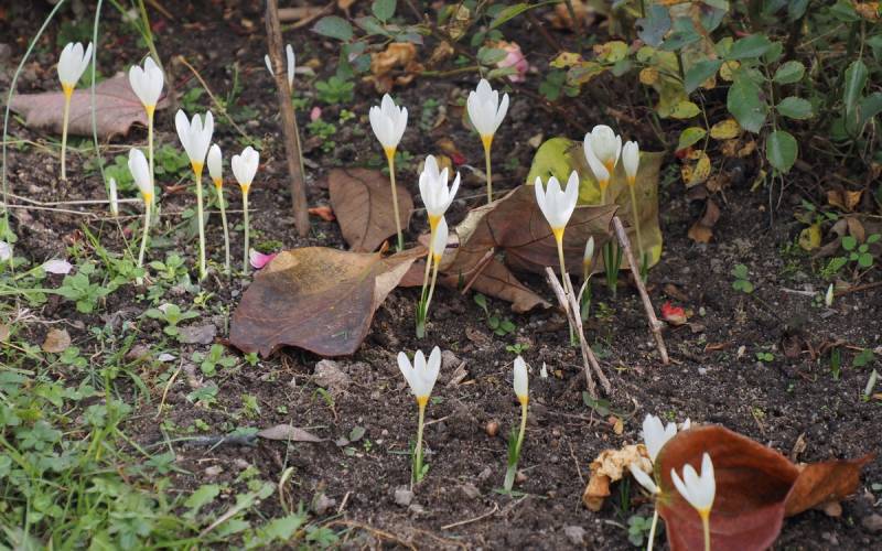 Kwiaty stosunkowo drobne, kremowobiałe z żółtą podstawą. Zakwita końcem października. Liście pojawiają się w trakcie kwitnienia.